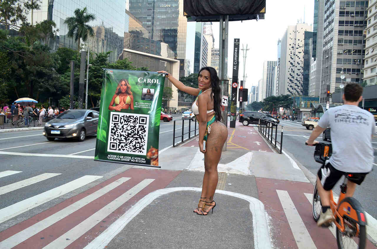 Participando do reality ‘A Grande Conquista’, Carol Lekker saiu nas ruas de São Paulo pedindo votos apenas de biquini