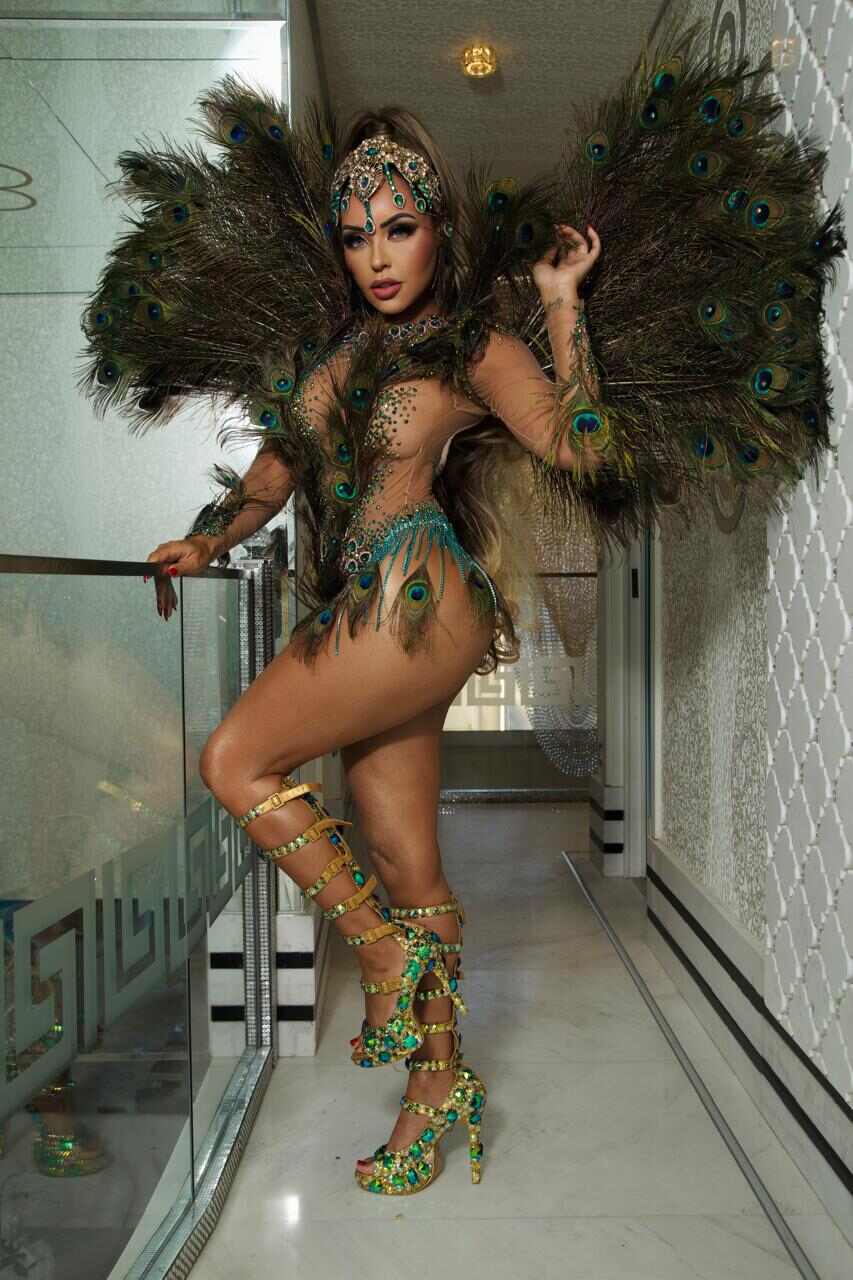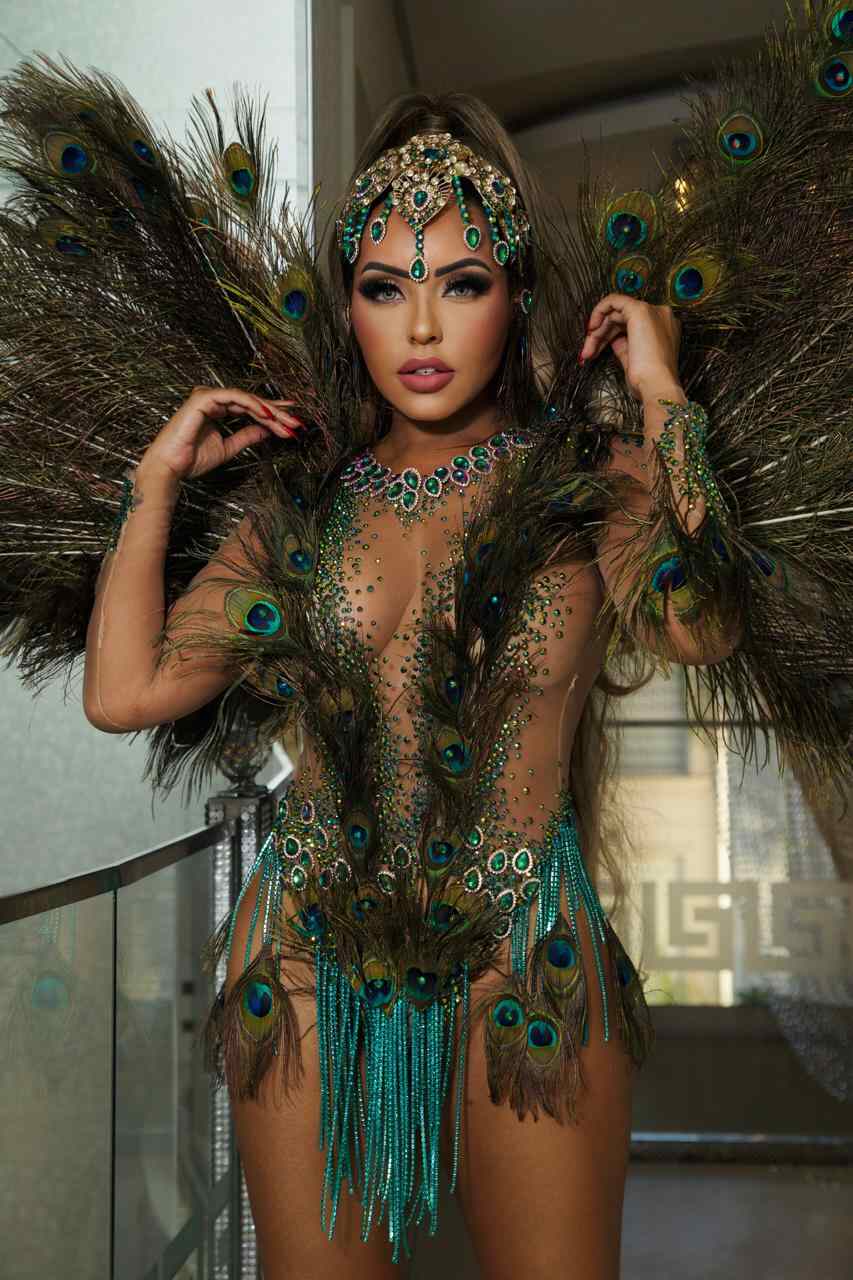 Com uma fantasia ousada, cravejada com cristais e 600 penas de pavão, Ana Beatriz colocou o corpão para jogo e ostentou boa forma. Para o desfile, a rainha promete um look na mesma linha: sensual, luxuoso e vibrante. Ela ainda apostará em um efeito especial na avenida.