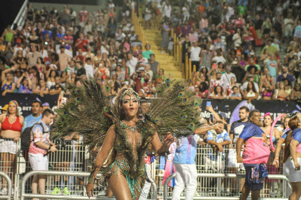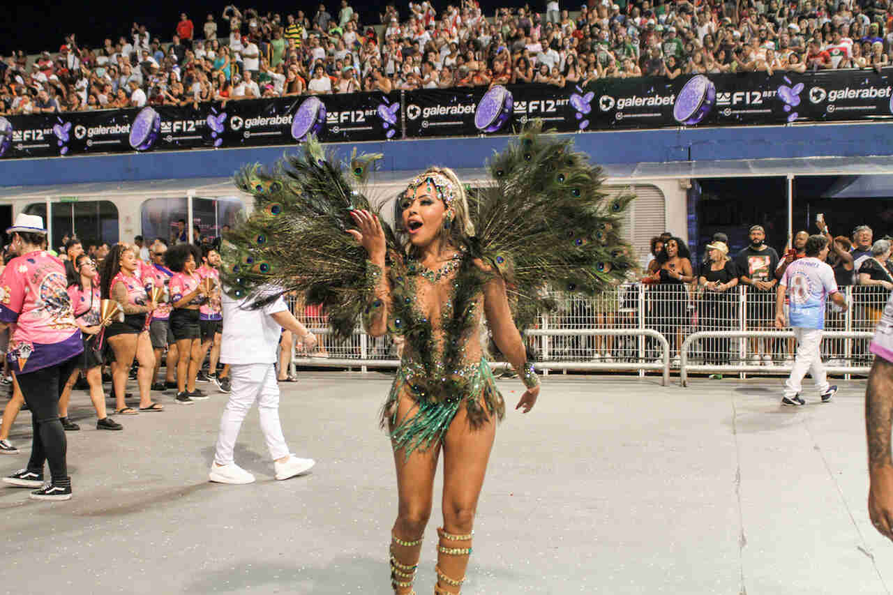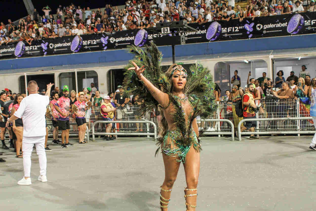 Em contagem regressiva para o Carnaval, Ana Beatriz Godoi brilhou no último ensaio técnico da Rosas de Ouro neste domingo (16). A rainha de bateria se inspirou no jogo do bicho e surgiu como ‘pavão’, um dos símbolos da loteria popular. O enredo da escola é justamente sobre jogos e apostas.