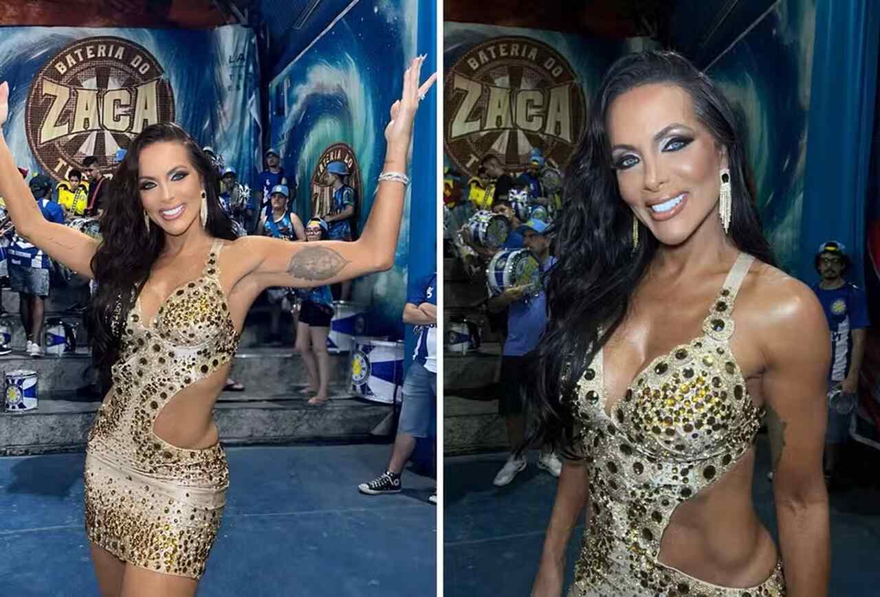 Com cabelos soltos ondulados e uma maquiagem impecável, Carla brilhou ao lado da bateria do Zaca, esbanjando simpatia e muito samba no pé.