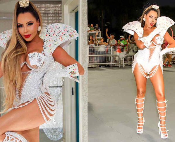Rainha da Rosas de Ouro usa look de 4 mil cristais inspirado em ‘cassino’ para ensaio pré-Carnaval