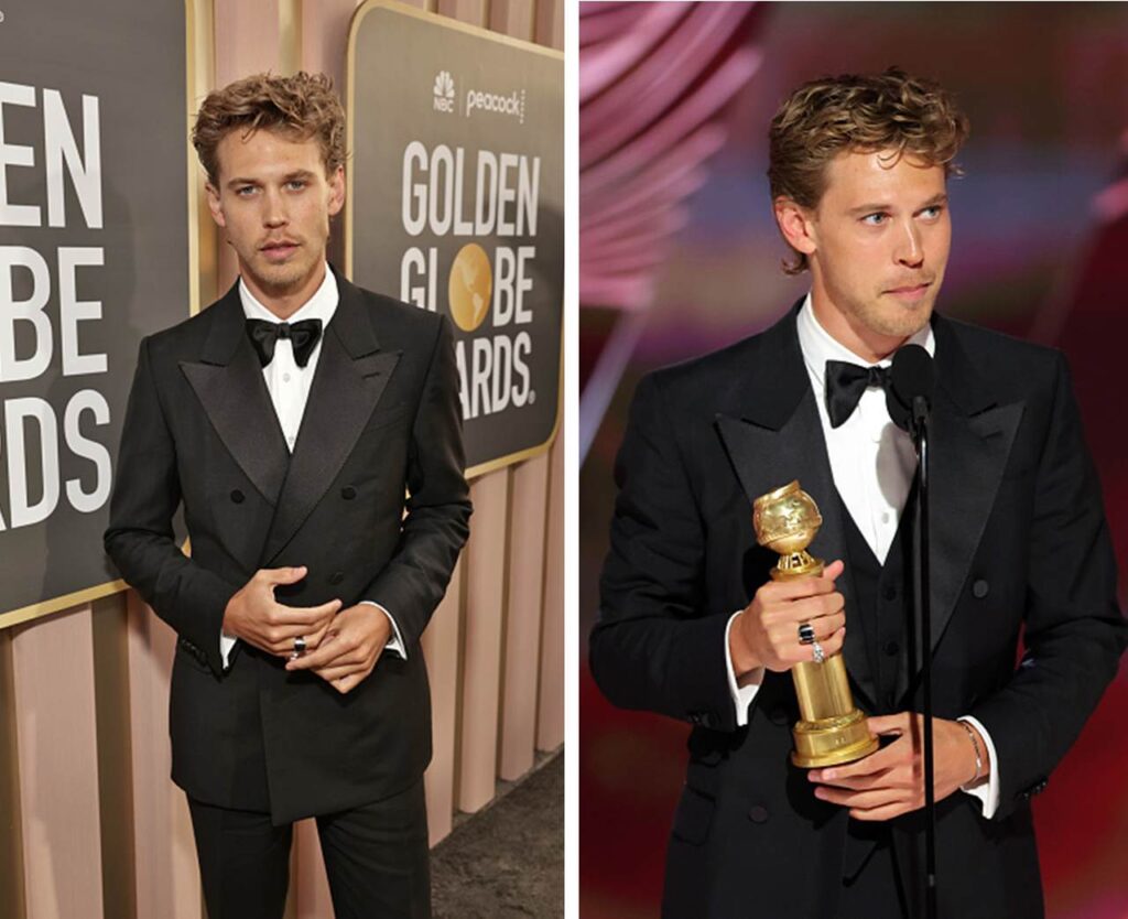 Austin Butler escolheu a pulseira Juste un Clou de 18K com diamantes, o anel Hawk’s Eye em ouro branco e o anel da coleção Panthère de Cartier de 18K em ouro branco com detalhe de diamantes, esmeraldas e ônix para compor seu look do Golden Globe Awards.