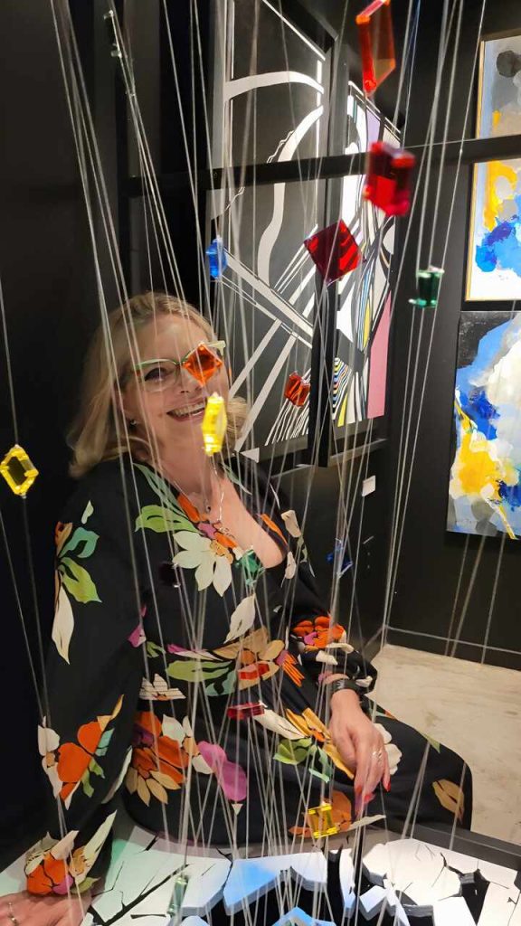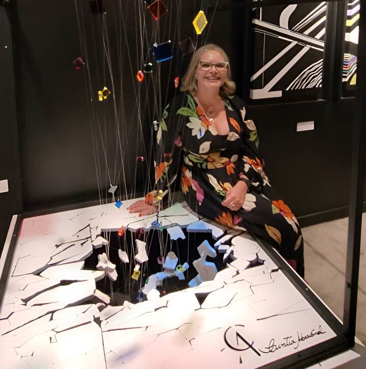 Composta por ferro, acrílicos e fios de nylon, a obra explora o conceito de ‘buraco negro’, ao utilizar a cor preto absoluto por entre os espaços do chão quebrado presente na base da instalação e de onde emergem cores vibrantes e formas em acrílico. A instalação reflete sobre os momentos em que a vida parece se partir, criando fissuras que, ao invés de apenas revelar o vazio, também possibilitam novas perspectivas e recomeços. “Minha intenção é fazer com que o público perceba a beleza que pode surgir das rupturas. Quero que as pessoas se conectem com sua própria jornada, entendendo que mesmo nos momentos mais difíceis é possível encontrar luz e transformação,” afirma Cintia.