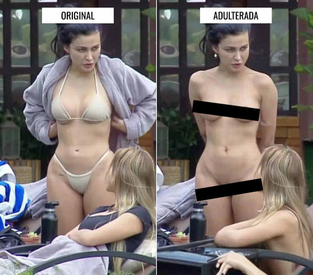 As imagens foram criadas com a ajuda de softwares de Inteligência Artificial. Nelas, Fernanda aparece em diferentes momentos. Nos prints originais, Fernanda aparece de biquíni, interagindo com outros participantes do programa.