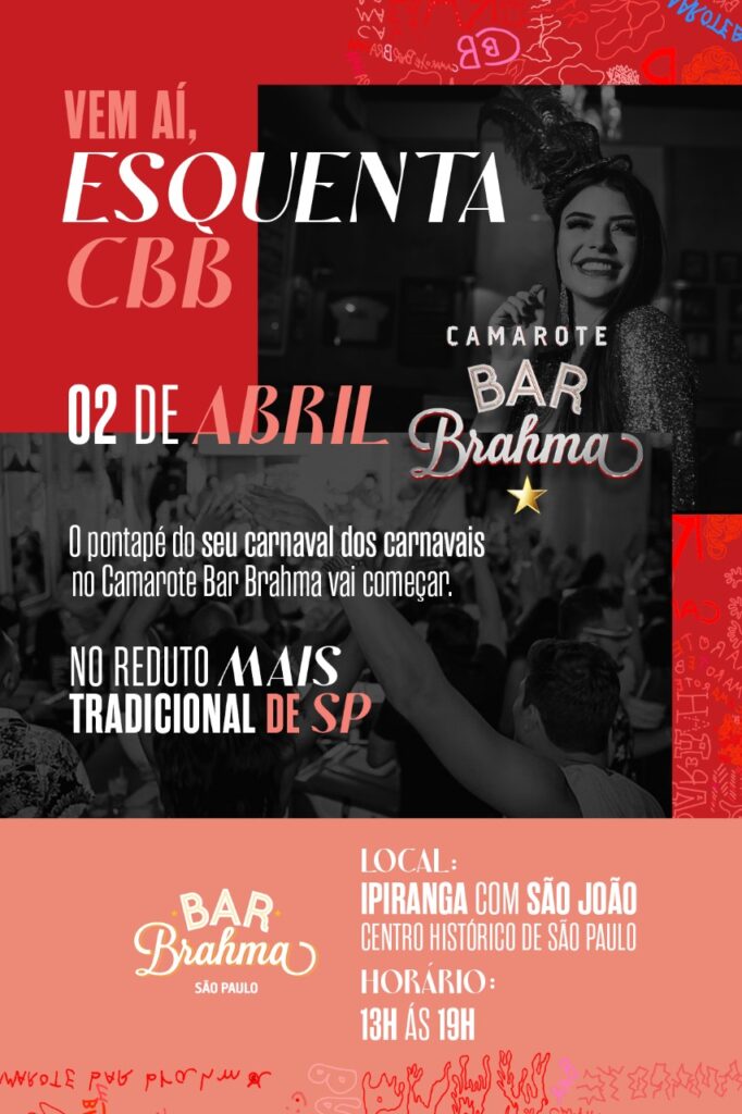O evento, que é open chopp, é o primeiro Esquenta CBB, que irá acontecer ao longo de todos os sábados (02, 09 e 16/04) que antecedem os desfiles das escolas de samba de São Paulo, com atrações especiais e distintas, além da participação de passistas. Após o esquenta deste sábado (02), o espaço ainda contará com a presença de André Youssef Trio e Blues Beatles. Aos interessados, a festa é aberta ao público, mediante a compra de ingressos pelo site oficial de vendas ou diretamente na entrada do local. Além da data, o Bar Brahma oferece ao público uma programação diversa todos os dias, com bandas ao vivo tocando o melhor do MPB, Pop, Samba e Blues.