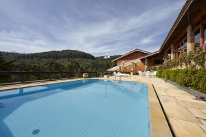 Espreguiçadeiras e o acesso à sauna seca do hotel ficam próximas à piscina externa, que garante diversão nos dias quentes de Monte Verde. Há ainda solarium e serviço de American Bar.