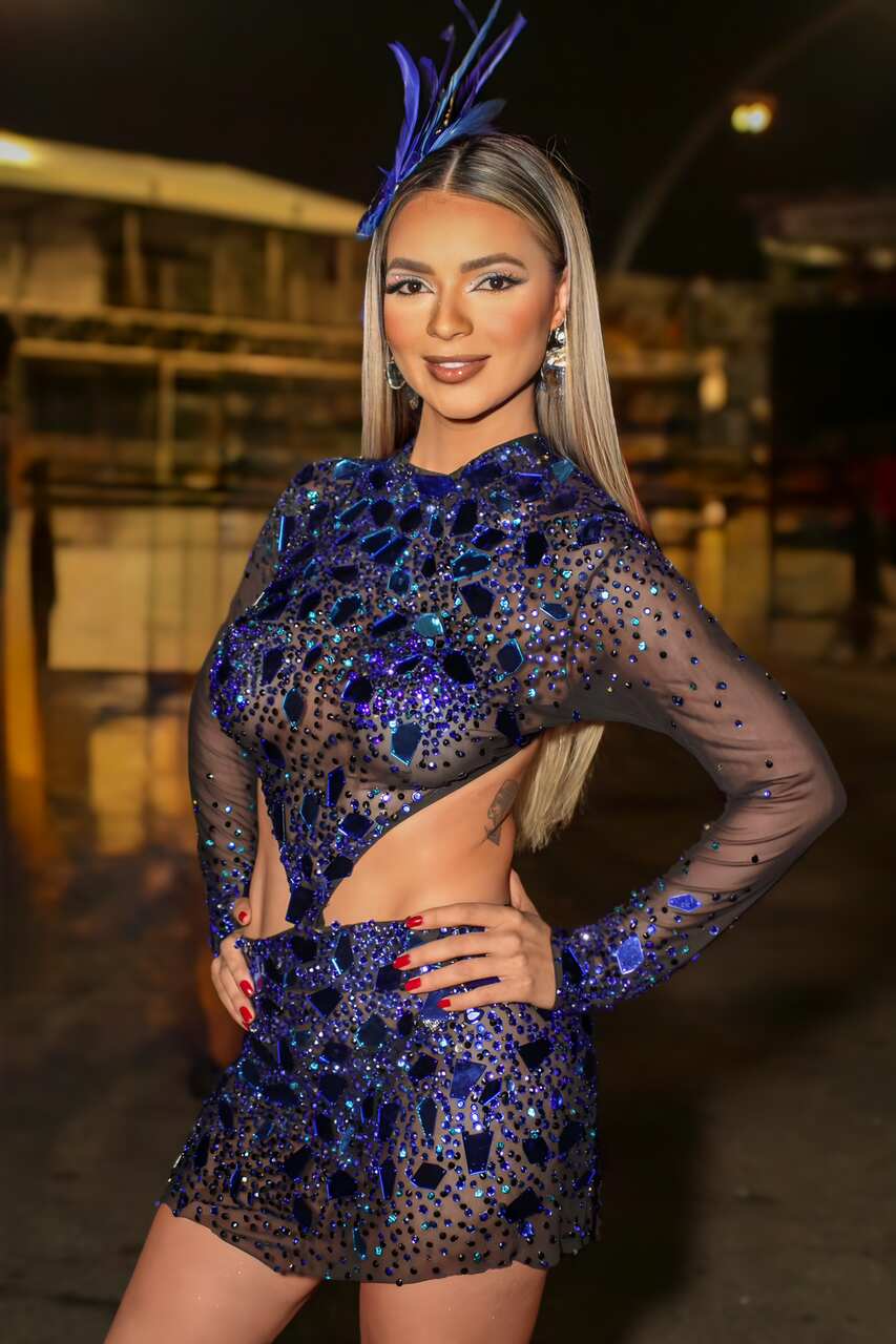 Josi Oliveira, musa da Colorado do Brás, escolheu um look comportado com transparência e cristais para o seu último ensaio técnico antes do desfile. Empresária e atriz, ela diz que o convite para o Carnaval foi inesperado e que desistiu de ser destaque de chão depois de um imprevisto na avenida.
