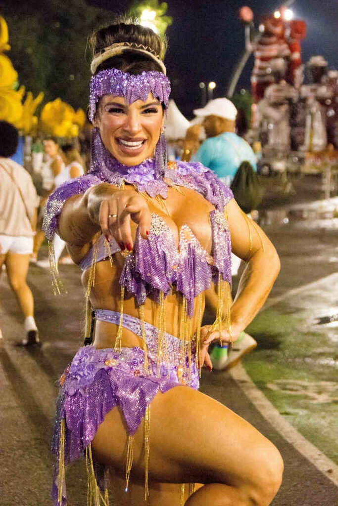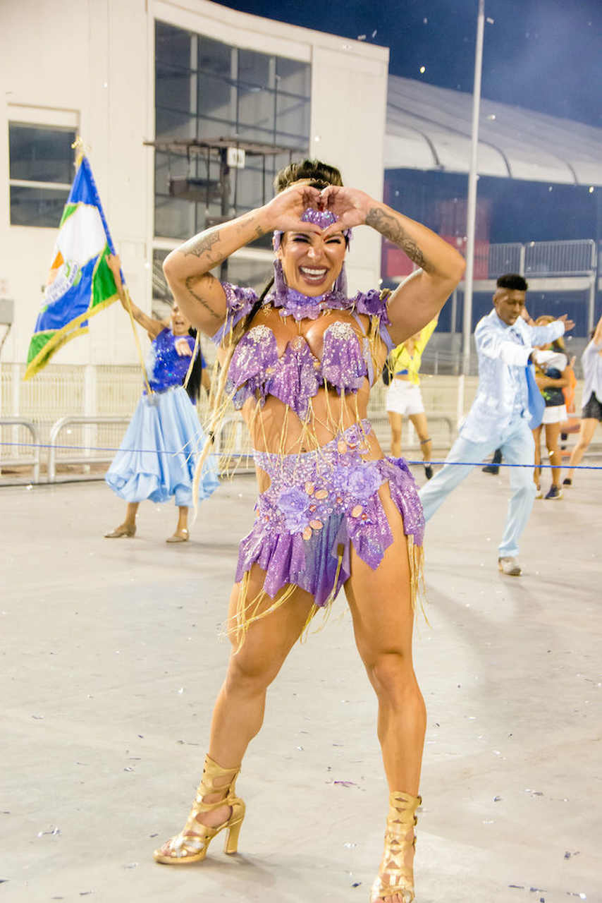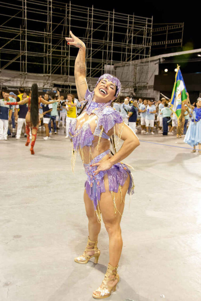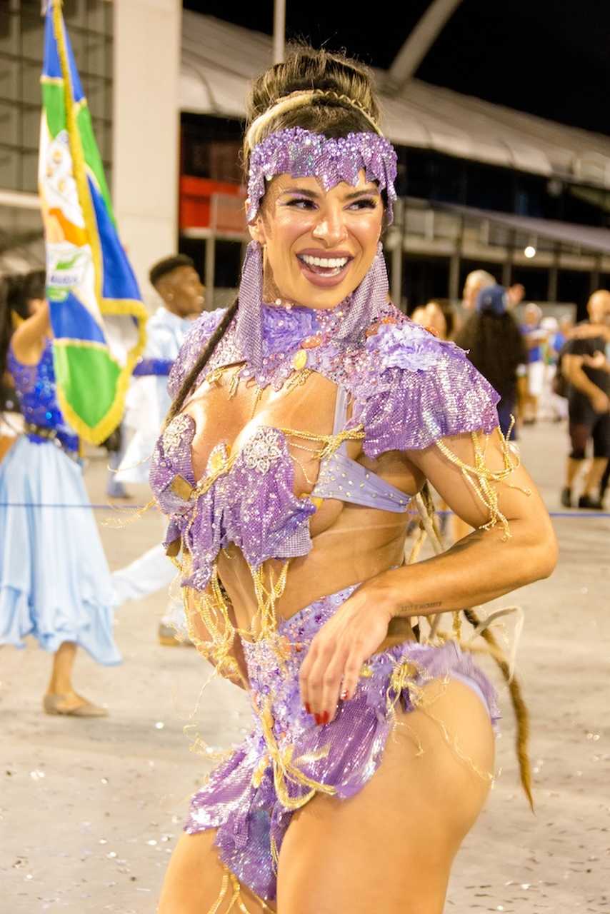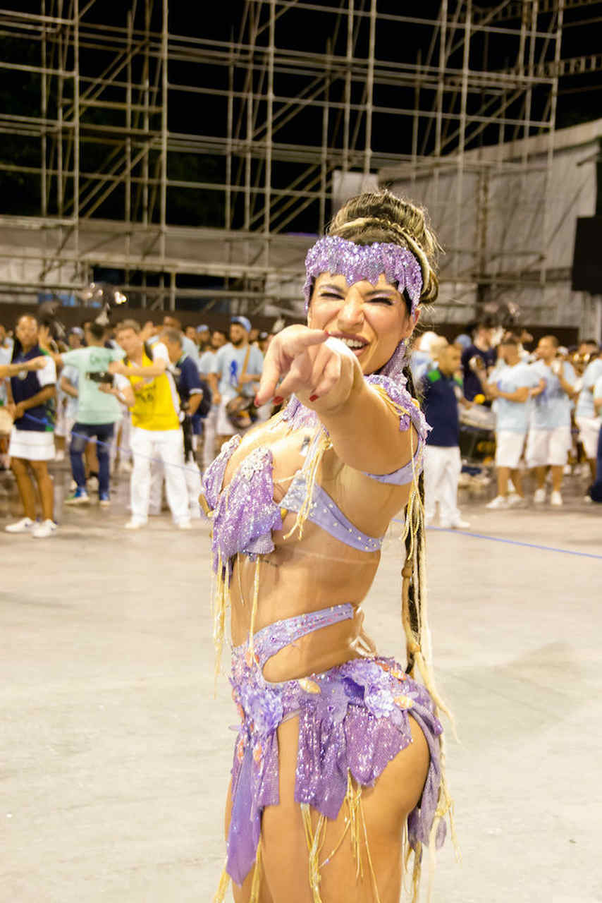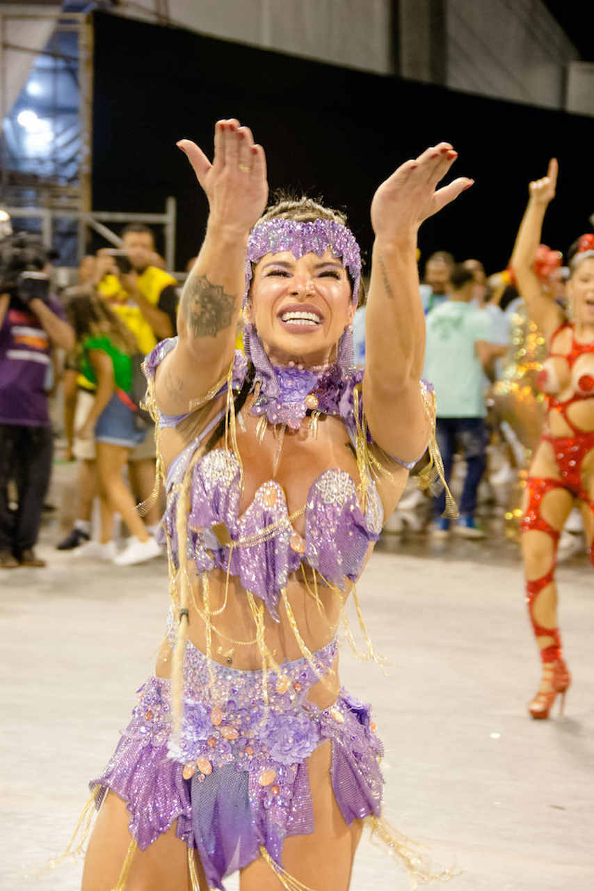 “Muita gente imagina que Carnaval é só glamour e não é nada disso”, começa rindo. “O meu primeiro desfile foi pela Acadêmicos do Tucuruvi, minha estreia foi linda e deu tudo certo. Mas no ano seguinte começaram os perrengues. A minha fantasia foi trocada em cima da hora, tive inclusive que entrar de topless. Joguei muito brilho no corpo e fui. Contrariada, mas entrei e me diverti. Foi um estresse total, mas hoje dou risada”, conta.
