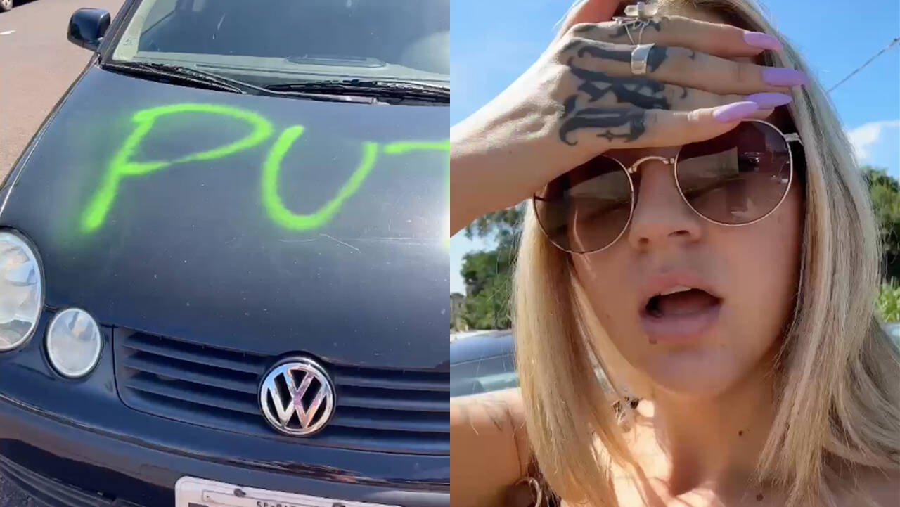 Mari explicou que foi à academia e deixou o carro estacionado nas proximidades. Ao voltar, encontrou o veículo pichado com a palavra “pu%$” no capô.