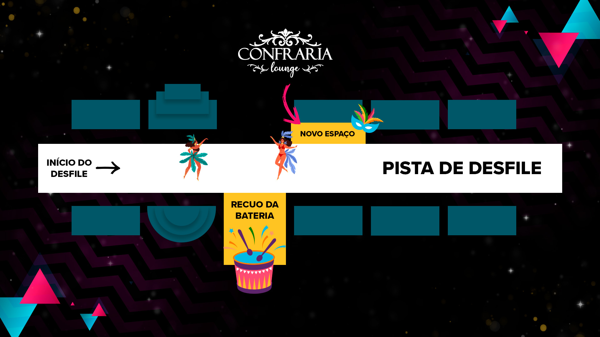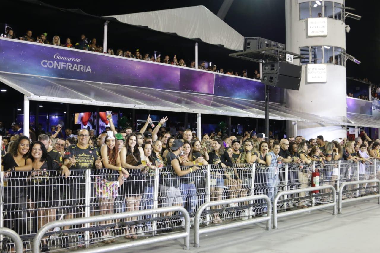 Espaço preparado para recepcionar 700 pessoas por noite, com 70 metros de frente para a pista de desfile, onde você pode ficar grudadinho na grade e acompanhar de pertinho a Escola do seu coração.